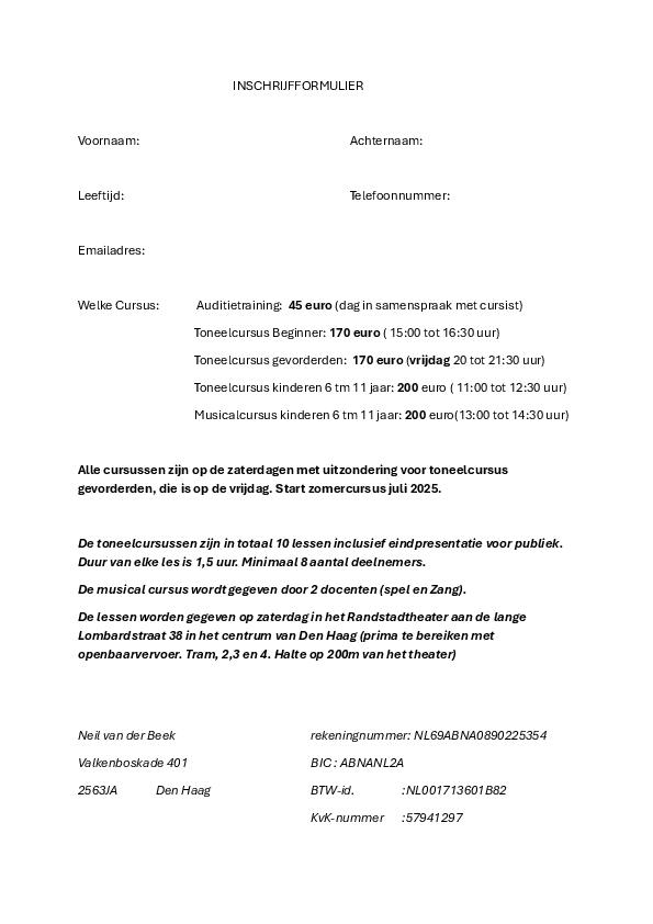 Alle cursussen zijn op de zaterdagen met uitzondering voor toneelcursus gevorderden, die is op de vrijdag. Start zomercursus juli 2025.